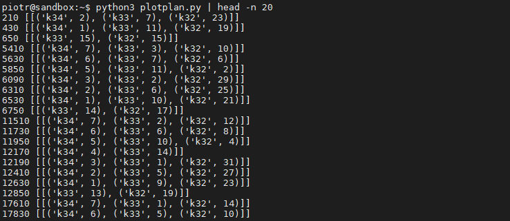 After few weeks I have already plotted big enough sample of different k-sizes so last thing left was finding biggest files from each category. I have a single harvester that has all the drives pooled with mergerfs so the fastest way was to list all files sorting them by size with ls -lS --block-size=M /mnt/chia/farm and pick largest ones (rounding them a bit) manually. My google-fu failed me this time and not being able to find efficient and satysfying solution online I came up with this script: